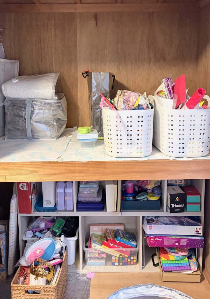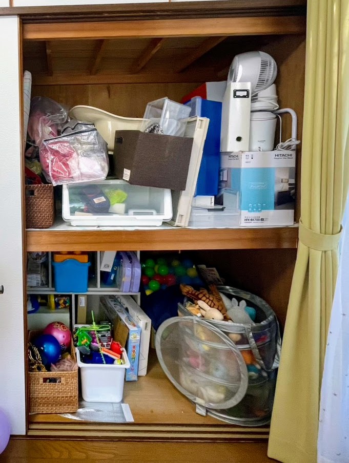 - 下段はおもちゃ収納を集約。よく使う一軍おもちゃをお子さん自身に選んでもらうことを宿題に。